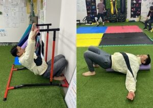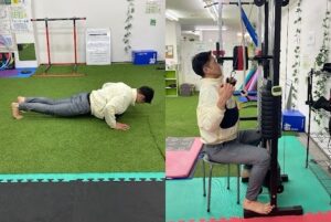 ストレッチで体をゆるめて、自重トレーニングを軽めにして、背中は斜め懸垂とケーブルマシンでやり、全身を無理のない範囲で動かすようにしています。